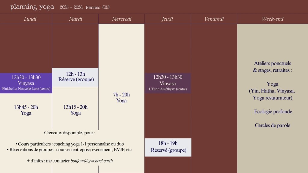 – mon histoire avec le Yoga, mon parcours, mes formations, etc. dans cet article : Gwenaël Le Nohaïc, professeure de Yoga certifiée